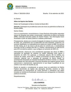 Outro ponto de preocupação levantado pela Senadora nos ofícios é a compra de carteiras de crédito feita pelo BRB entre agosto e dezembro de 2024, no valor de R$ 5,9 bilhões. Desse total, R$ 4,7 bilhões vieram do Banco Master, cuja operação foi posteriormente barrada pelo Banco Central e que tem histórico de problemas de liquidez e suspeitas sobre a qualidade de seus ativos.